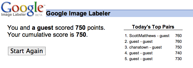 While I have Google Images in mind, I recall seeing a pair of students playing a game one day in the lab using Google Images. Titled Google Labeler, this "game" puts a pair of random people (you and another user) together to create labels for as many images as possible. Trying this out today, I found this entertaining, earned a top score, and I could see a similar game being played in the classroom. As an example, I can imagine science classes giving students a set of images and instead of telling them what they were looking at, they could have students try guessing labels with a partner. It would be interesting to see what common labels each group came up and then using this as a starting point for a deeper discussion on the topic. Another example would be an art class introducing a specific painter or style of art.